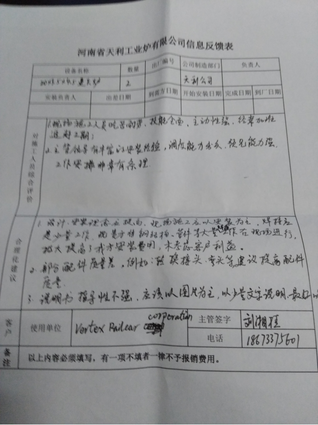 本工程9月20日接到VRC郵件正式通知,要求25日到達威爾明頓,現場確認地基數據后,計劃10月3日開始澆筑基礎地基,我公司按照對方計劃安排購買了9月25日王振廣到達、其余5人10月7日到達的機票,由于7日颶風影響及土建承包商拖延工期致使澆筑時間由原計劃10月3日澆筑拖延到10月18日,到10月20日現場施工才開始進行,公司團隊現場克服種種困難想出多種辦法追趕工期,終于在11月15日按照原計劃先期回國3人,23日完成了部分動作及點火調試,由于VRC公司沒有成品油罐車及需要建造防雨棚無法進行帶料熱調試,我公司人員于11月25日回國。