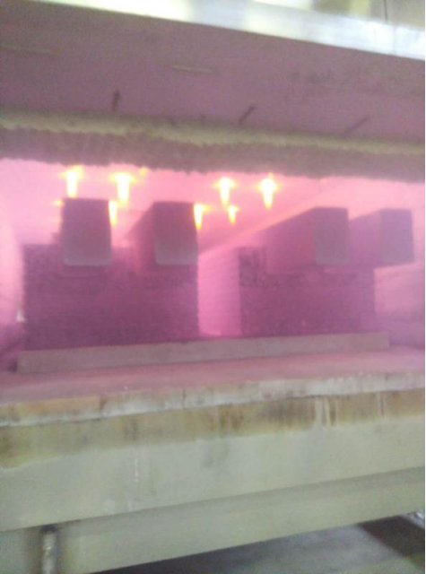 Pig iron casting cathode carbon block heating furnace consists of three separate heating chambers, these three heating chambers can operate together, also can separate operate; continuous structure adapts to the continuous production.