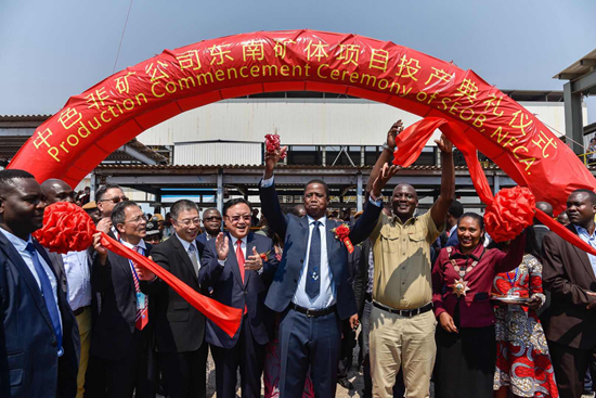 倫古總統(tǒng)和王彤宙董事長(zhǎng)為投產(chǎn)紀(jì)念牌揭牌